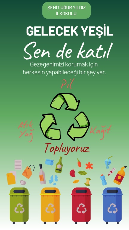 Enerji Dostu Mavi Yeşil Okul Projesi kapsamında 2/C öğretmenimiz Ahmet Orhan'ın düzenlediği Ödüllü Sıfır Atık kampanyası okulumuzda başladı. Öğretmenimizin temin ettiği atık pil kutuları sınıflarımıza dağıtıldı. Geri dönüşüm kutularımiz koridorlarda yerini aldı. Kampanyamızı yürüten öğretmenimiz Ahmet Orhan'a teşekkür ederiz.